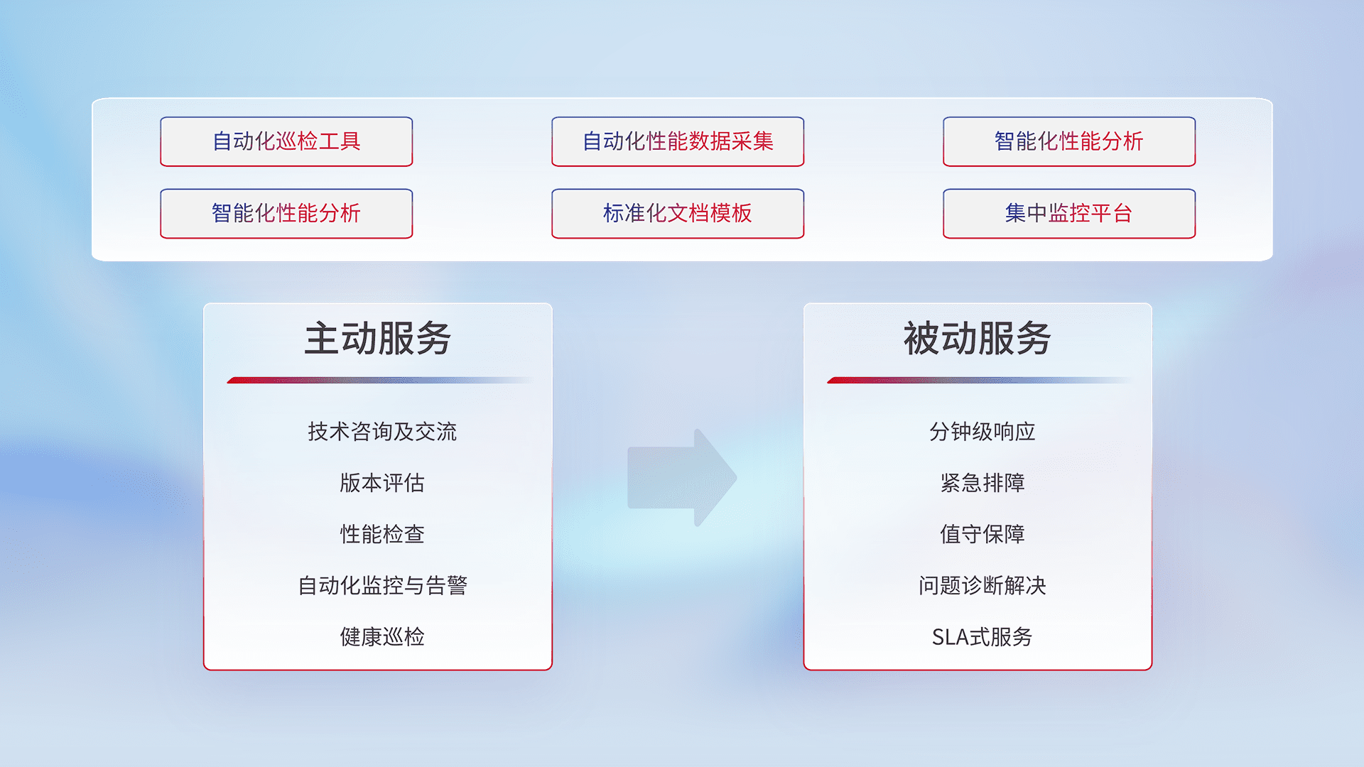 智能化工具和标准化文档,,,,保障服务质量,,提供主动服务(包含技术咨询、、版本评估、、、、性能检查、、自动化监控与告警、、健康巡检)和被动服务包含(分钟级响应、、紧急排障、、值守保障、、、问题诊断解决、、SLA服务)。。
